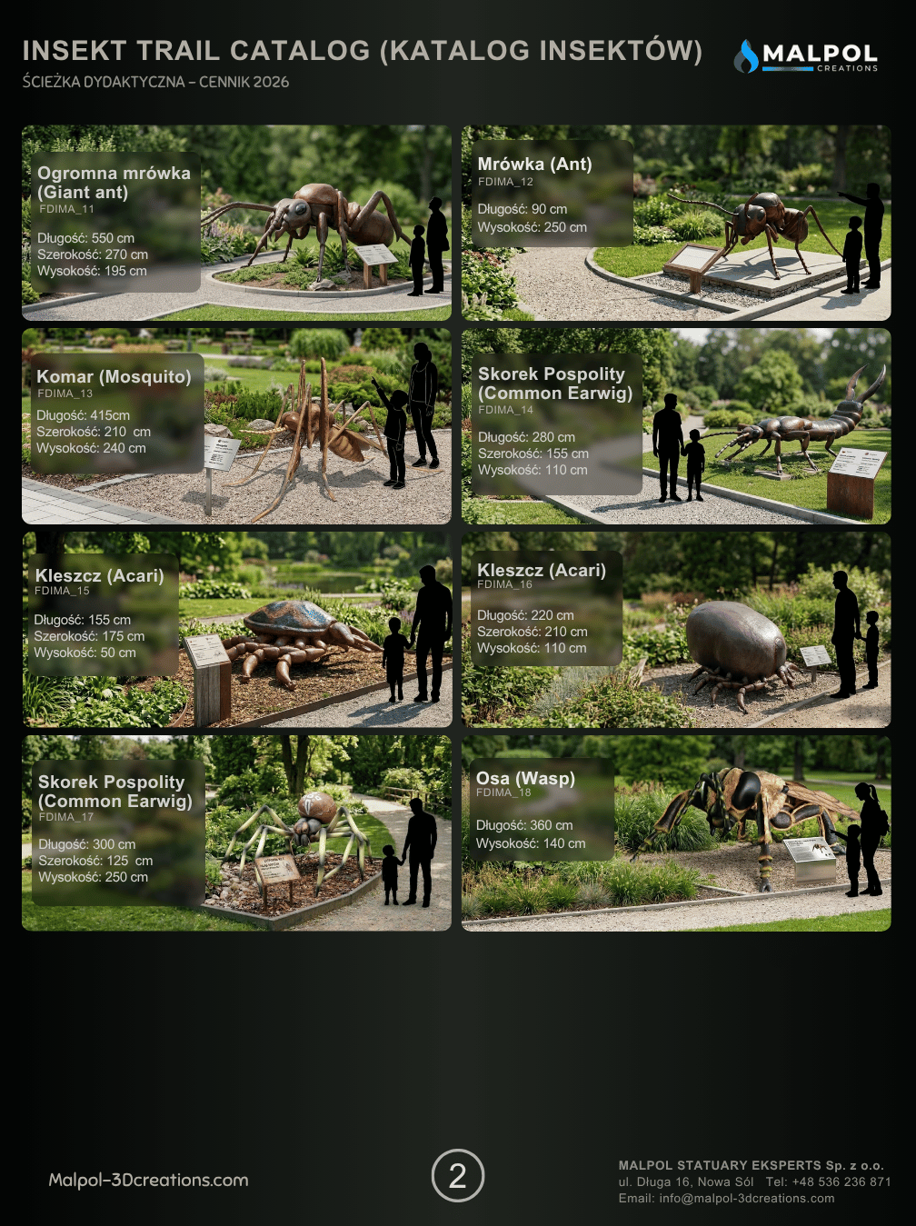Dydaktyczne makiety (Giant Insects) w skali XXL. Makiety z fiberglassu łączy zaawansowane modelowanie 3D z precyzją, oferując pełną odporność na wandalizm i warunki atmosferyczne na przyrodniczych ścieżkach edukacyjnych.